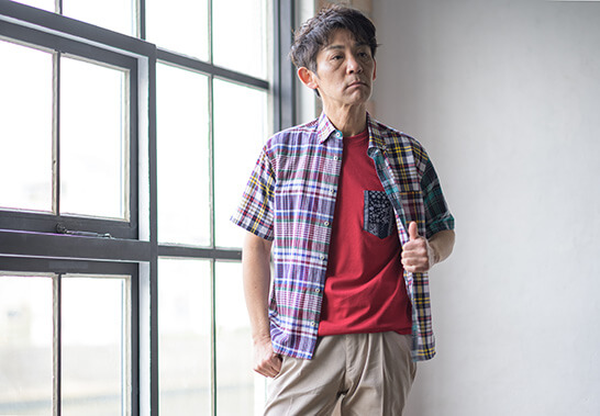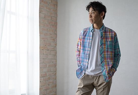春夏を代表する素材のインドマドラス。独特の表面感のミラクルウエーブを贅沢にパッチワーク風にアレンジしたデザインシャツを提案。